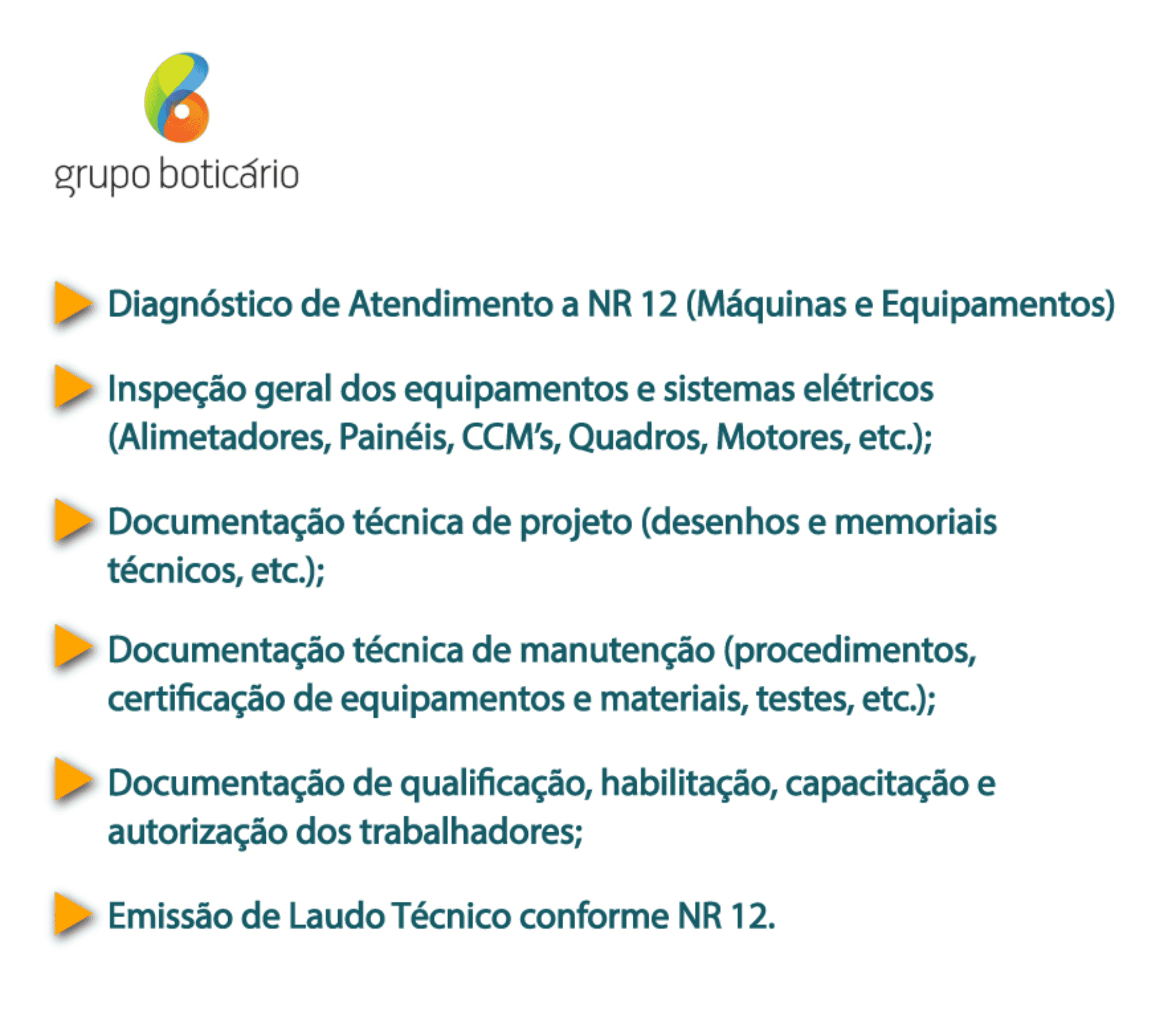 O Grupo Boticário investe fortemente na segurança de suas operações, com foco no atendimento à NR 12 – norma que regulamenta a segurança no trabalho com máquinas e equipamentos. A consultoria especializada inclui diagnóstico de conformidade, inspeção de sistemas elétricos, elaboração de documentação técnica de projeto e manutenção, além de qualificação e autorização dos trabalhadores. Também é emitido Laudo Técnico conforme os requisitos da NR 12, garantindo segurança jurídica e operacional.